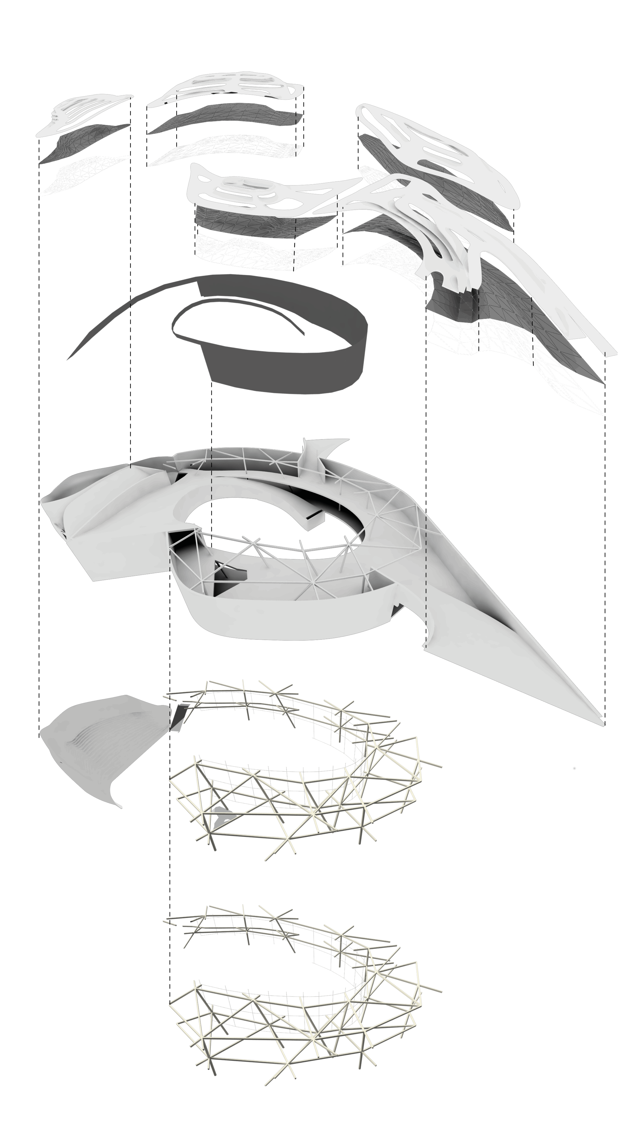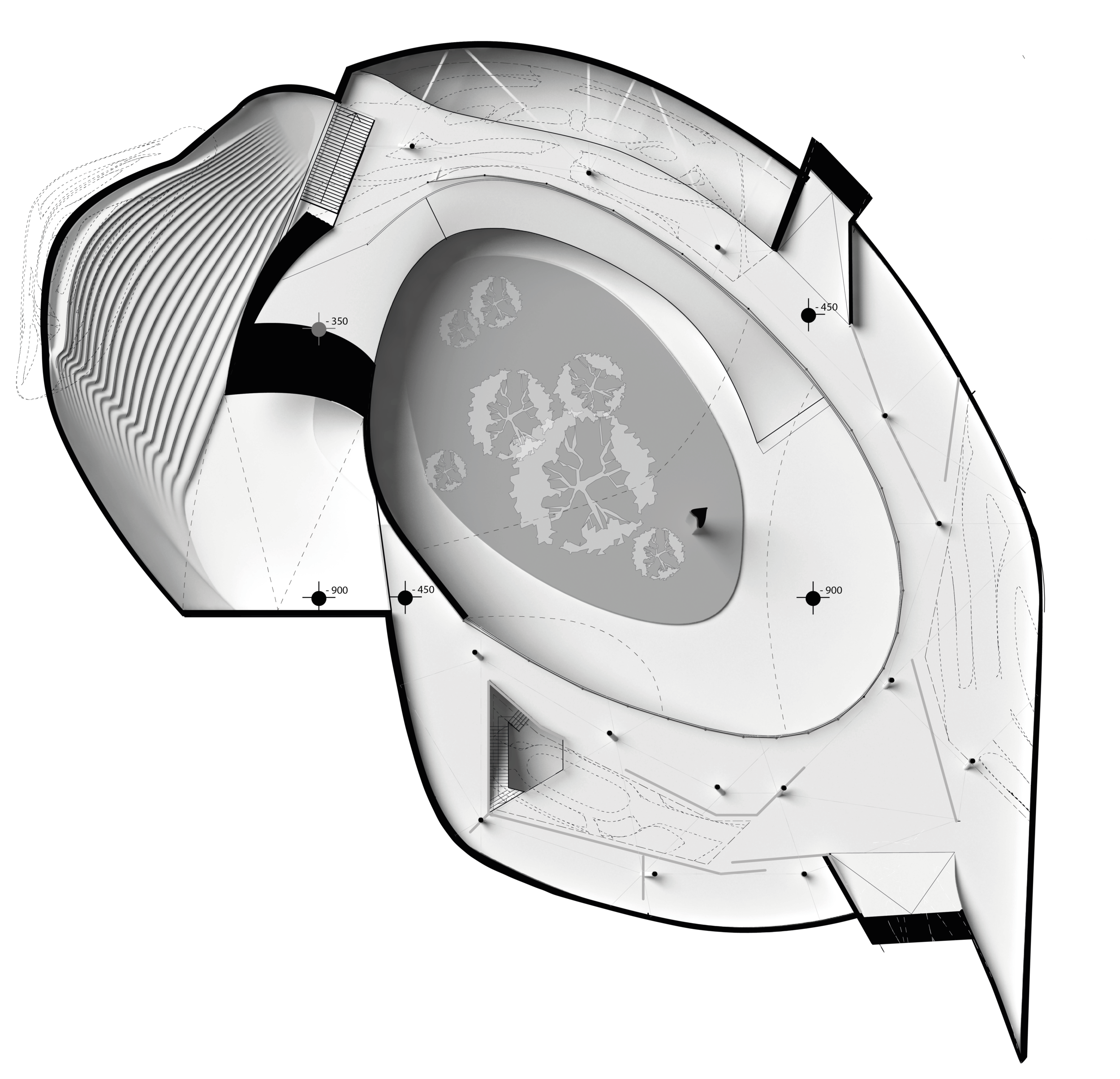 In stage one a building is knocked down and replaced by an architectural seed, a structure free of any traditional program. The open layout does not determine a singular utilisation. Merely zones suggest heterogeneous spatial qualities. For instance, zone A facilitates gathering and social activities, while zone B features a juxtaposition between upper and lower levels or zone C relations of inside and outside. Circular levels located underground have a more functional layout, catering pragmatic purposes while the layout of uppers levels enables a permanent occupation. The aperture of the roof serves as a seating accomodation with visual connection to the inside of the building while the ground level is left undeveloped.